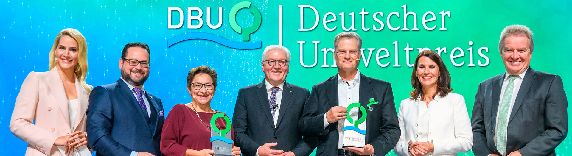 Headerbild: Gemeinsame Freude über den Deutschen Umweltpreis (v.l.): Moderatorin Judith Rakers, DBU-Generalsekretär Alexander Bonde, Preisträgerin Prof. Dr. Ingrid Kögel-Knabner, Bundespräsident Frank-Walter Steinmeier, Preisträger Reinhard Schneider, DBU-Kuratoriumsvorsitzende Rita Schwarzelühr-Sutter und Baden-Württembergs Umweltminister Franz Untersteller. © DBU/Peter Himsel
