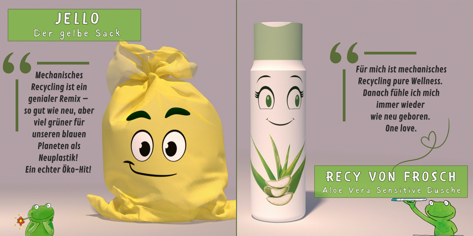 In der Kampagne dreht sich alles um die ressourcenschonende Kreislaufwirtschaft, das mechanische Recycling und natürlich um die Produkte von Frosch in Verbindung mit dem Gelben Sack als Quelle für qualitativ hochwertige Kunststoffverpackungen aus Rezyklat.