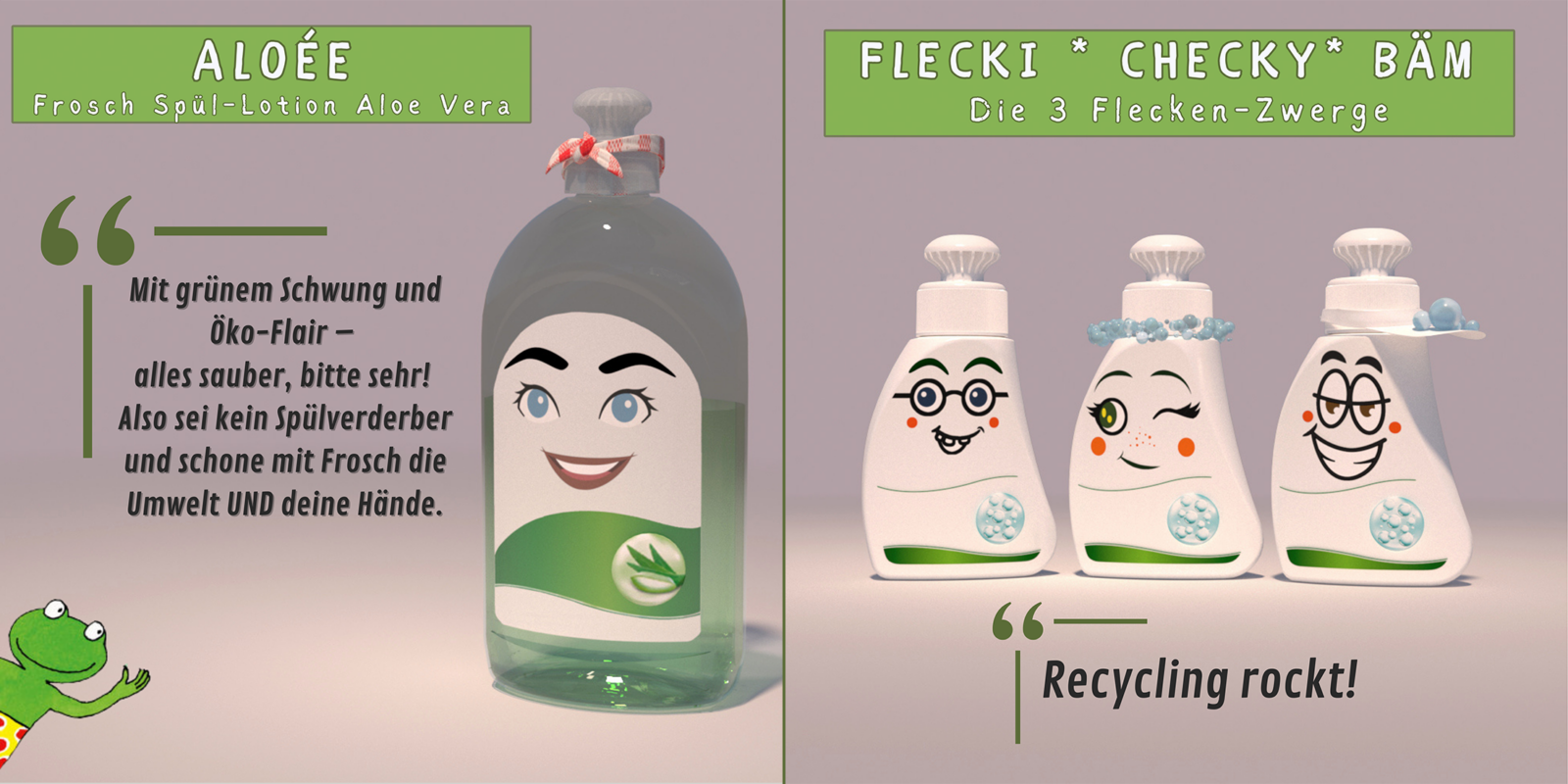 Die Duschgel-Flasche Recy von Frosch arbeitet als Lehrerin an der Recyclat-Schule und fördert Entwicklung und Bewusstsein der drei Fleckenzwerge in Bezug auf die gelebte Kreislaufwirtschaft. Recy schätzt Jellos Fürsorge und Unterstützung und wird nicht müde zu betonen, dass er das „Eintrittstor“ zum hochwertigen mechanischen Recycling ist.