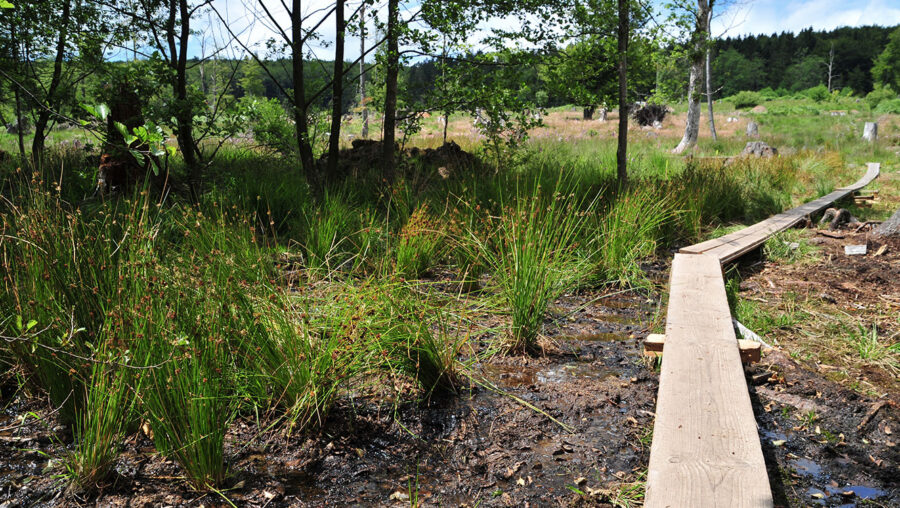 Road construction, draining and deforestation over the years caused significant changes and, in some cases, the loss of bog habitats. Where the moor is drained, the peat dries out, begins to mineralise and disintegrates. The process not only leads to the loss of a natural environment with unusual plants and animals, but also releases into the atmosphere the carbon dioxide which had been held in the intact bogs. Protection of the bogs, therefore, contributes to climate protection.