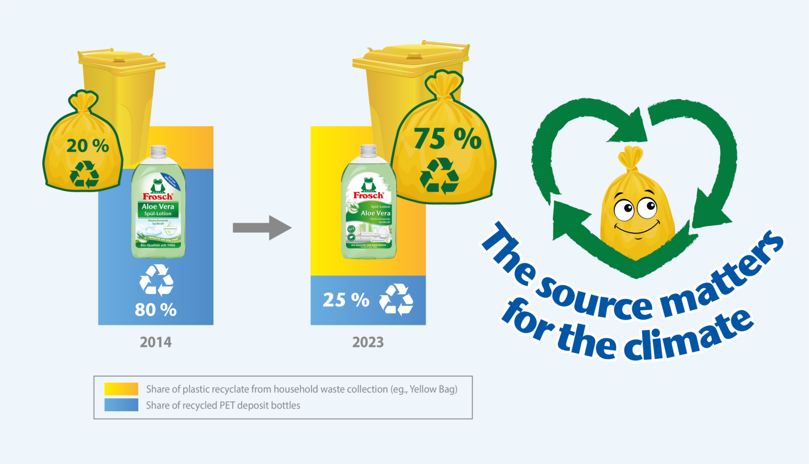 With yet another increase in the share from household waste collections, Werner & Mertz and ALPLA continue the success story of their cooperation. The Recyclate Initiative was launched back in 2012 by Werner & Mertz, together with ALPLA and other cooperation partners from the entire value chain. Committed to using Post-Consumer Recyclate (PCR), the Initiative partners say that used plastic (Post-Consumer Recyclate or PCR) from household waste collections should be utilized as input material, reprocessed after use, re-used as recycled and recyclable material, and thereby kept in a closed loop. In 2014 the initiative succeeded in producing PET bottles for the well-known Frosch brand from 100 percent PCR, 20 percent of which came from the Yellow Bag. In February 2021 the next increase to 50 percent followed and in 2023 the share reached 75 percent.