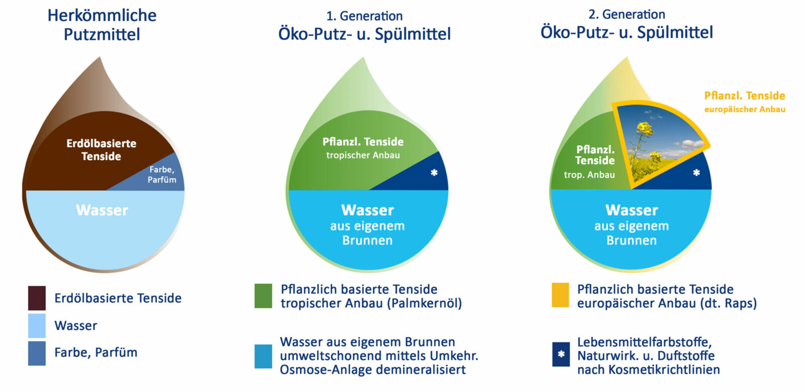 Unser Unternehmen setzt seit jeher für unsere Produkte auf naturbasierte Wirkstoffe wie zum Beispiel Essig, Zitrone oder Soda. Ein Großteil unserer Reinigungsmittel besteht jedoch aus waschaktiven Substanzen, den sogenannten Tensiden. Dank ihnen löst sich der Schmutz beim Waschen oder Reinigen im Wasser auf.