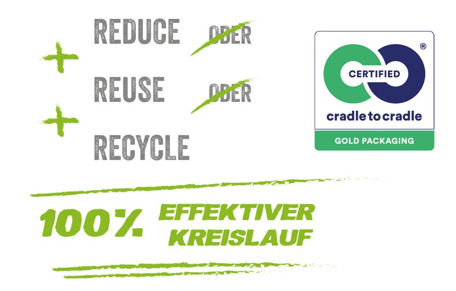 Werner & Mertz ist ein weiterer Meilenstein im Rahmen der Recyclat-Initiative für eine echte Kreislaufwirtschaft gelungen: Die erste flexible Verpackung weltweit, die in allen Kategorien der Cradle to Cradle Certified® – Product Scorecard Gold erreicht hat. Der vollständig recyclingfähige Beutel aus Monomaterial (Polyethylen) mit abnehmbarer Banderole ist das Resultat eines mehr als fünfjährigen Gemeinschaftsprojekts von Werner & Mertz mit dem globalen Verpackungs- und Papierkonzern Mondi und löst das Problem des Recyclings bedruckter Kunststoffe: Rund 85% des gesamten Verpackungsmaterials sind unbedruckt. Das heißt, das Material lässt sich ohne Qualitätsverlust hochwertig recyceln. Doch auch die restlichen 15%, die bedruckte Banderole, ist voll recycelbar, da sie frei von Klebstoffen und Haftvermittlern ist, und so in neue Anwendungen zurückfließen kann.