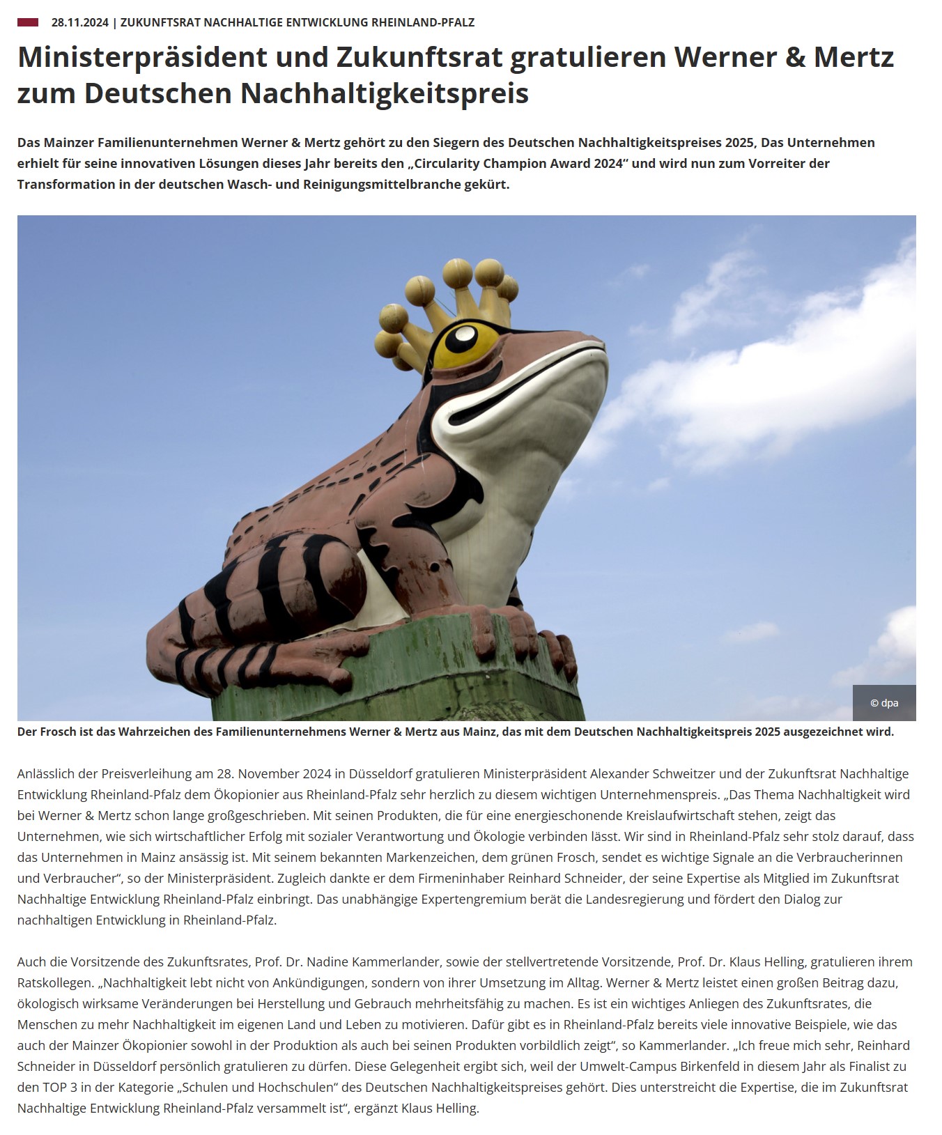 Der rheinland-pfälzische Ministerpräsident Alexander Schweitzer und der Zukunftsrat Nachhaltige Entwicklung Rheinland-Pfalz gratulierten Werner & Mertz anlässlich der Preisverleihung sehr herzlich.  „Das Thema Nachhaltigkeit wird bei Werner & Mertz schon lange großgeschrieben. Mit seinen Produkten, die für eine energieschonende Kreislaufwirtschaft stehen, zeigt das Unternehmen, wie sich wirtschaftlicher Erfolg mit sozialer Verantwortung und Ökologie verbinden lässt. Wir sind in Rheinland-Pfalz sehr stolz darauf, dass das Unternehmen in Mainz ansässig ist. Mit seinem bekannten Markenzeichen, dem grünen Frosch, sendet es wichtige Signale an die Verbraucherinnen und Verbraucher“, so der Ministerpräsident.