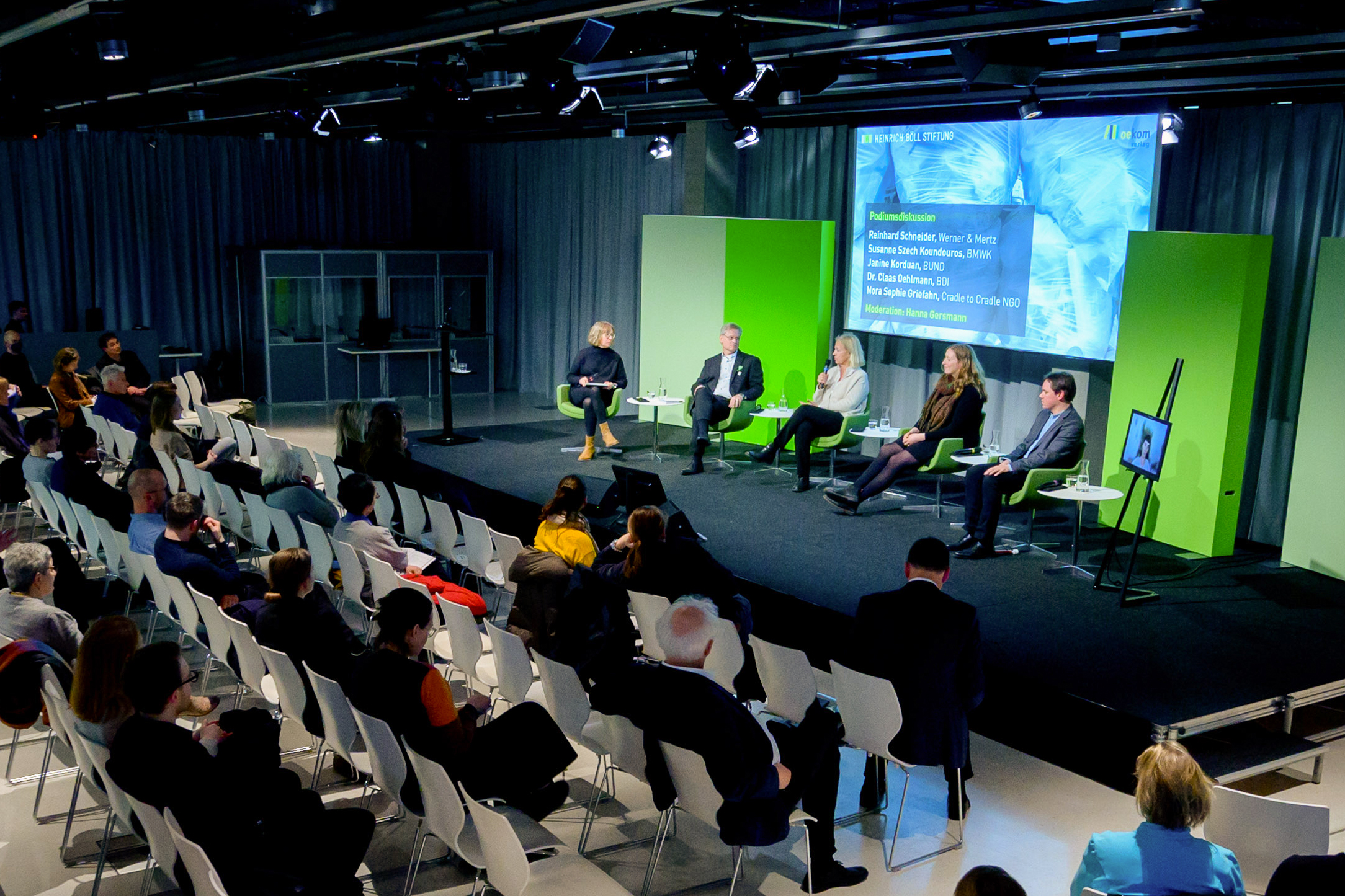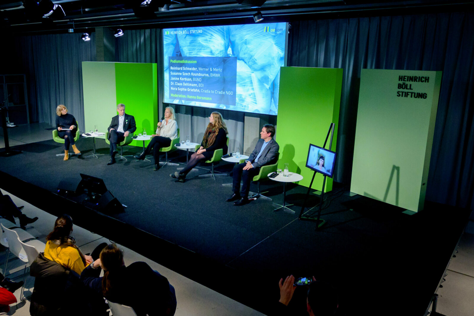 Diese Themen diskutierten im Anschluss Susanne Szech-Koundouros vom Bundesministerium für Wirtschaft und Klimaschutz (BMWK), Janine Korduan vom Bund für Umwelt und Naturschutz Deutschland (BUND e.V.), Dr. Claas Oehlmann vom Bundesverband der Deutschen Industrie (BDI e.V.), Nora Sophie Griefahn von Cradle to Cradle NGO und der Autor des Buches Reinhard Schneider.
