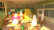 In den beiden Spots „Fleckenzwerge in der Rezyklat-Schule“ und „Fleckenzwerge im Recyclatventure-Park“ haben drei weitere Charaktere ihren großen Auftritt: die Fleckenzwerge Flecki, Checky und Bäm. Sie sind ein quirliges Trio mit viel Charme und frechem Witz. Gemeinsam besuchen sie die Recyclat-Schule von Frosch, um das große 1×1 der gelebten Kreislaufwirtschaft zu lernen. Für ihre drei Charaktere haben die Filmemacher eigens eine fiktive Sprache entwickelt. Fleckenzwergisch enthält teils erfundenen Wörter und Begriffe, aber auch Anlehnungen an bekannte Sprachen. Was zunächst wie ein niedliches Kauderwelsch klingt, dient dazu, wichtige Schlüsselwörter spielerisch zu vermitteln. Die anderen Akteure verstehen die Zwerge natürlich und übersetzen ihre Aussagen für die Zuschauer*innen.
