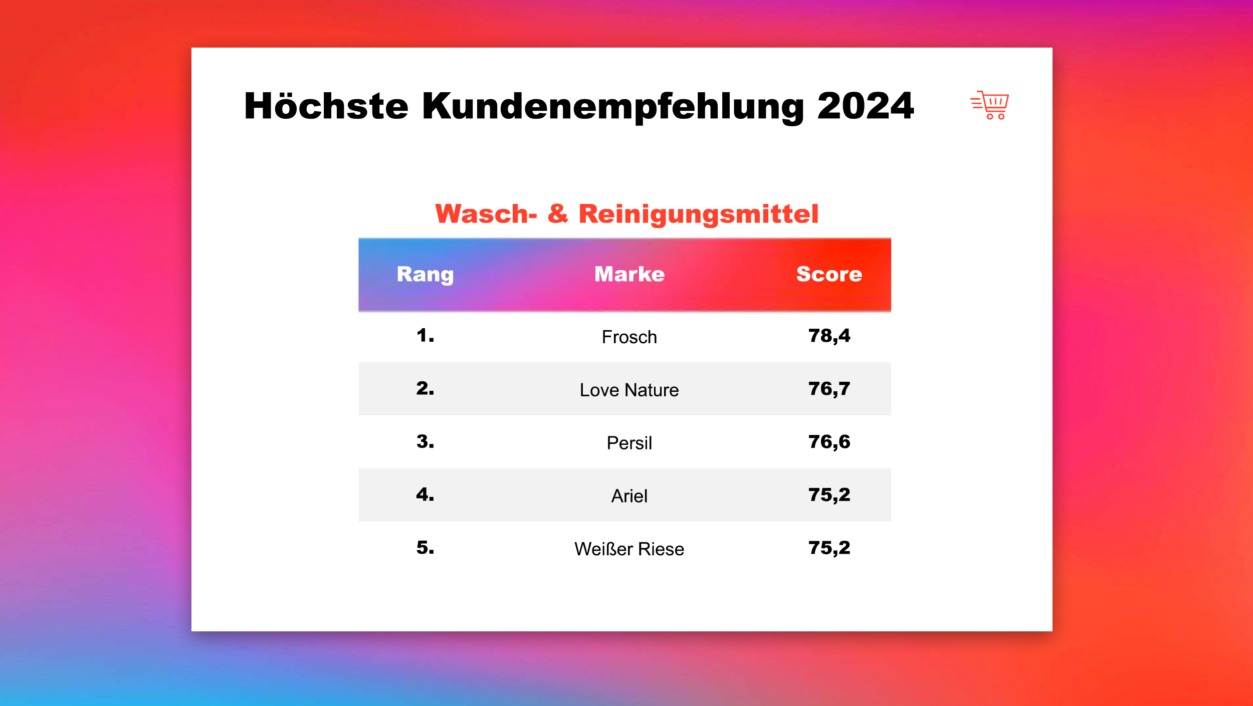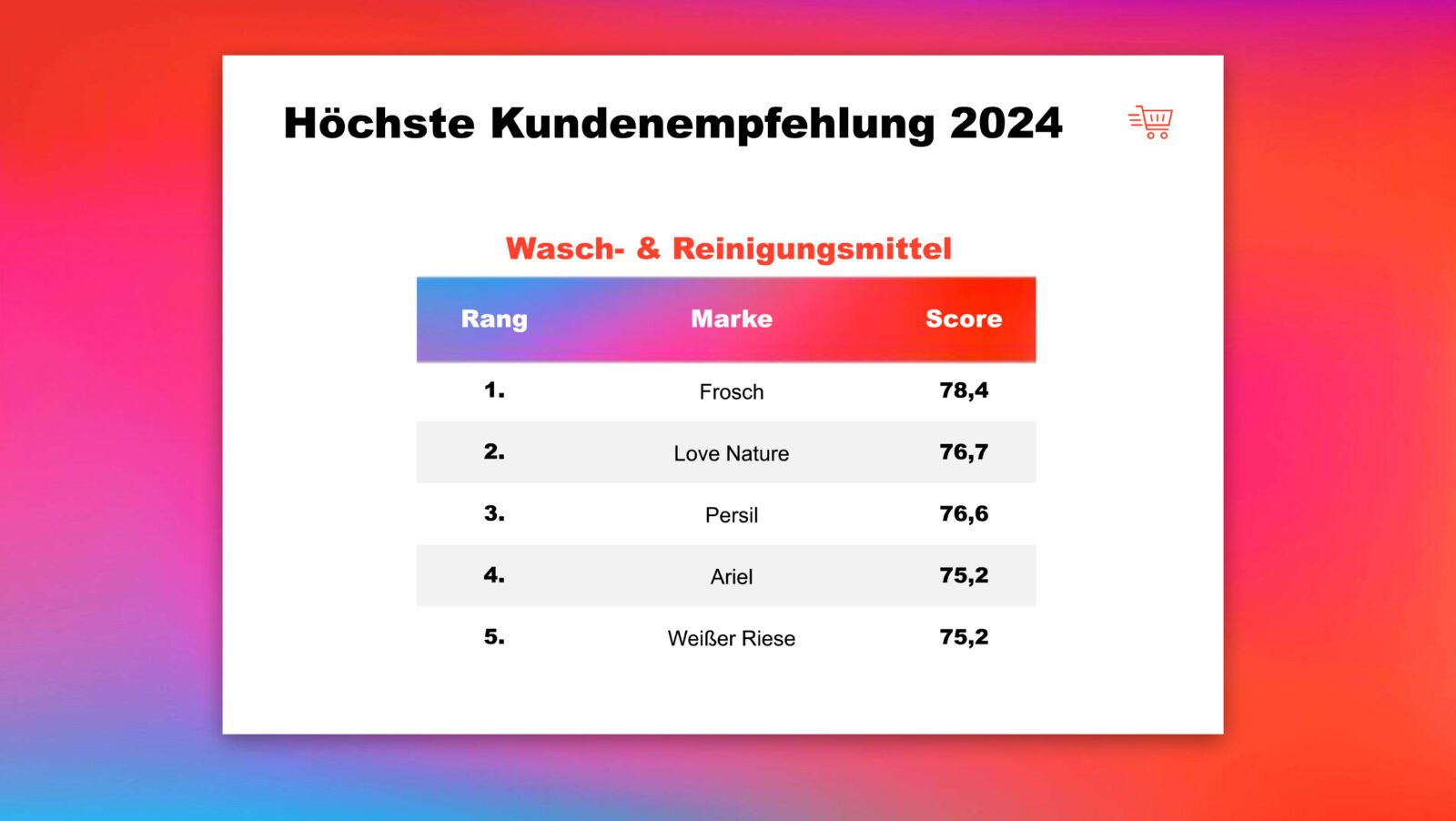 Die Marke Frosch genießt hohes Vertrauen unter Verbraucher*innen – das belegt erneut das Ranking von YouGov in Kooperation mit dem Handelsblatt zur „Höchsten Kundenempfehlung 2024“: Die Dachmarke Frosch erzielte das zweite Jahr in Folge Platz 1 im Bereich Wasch- und Reinigungsmittel! Die Studie legt die spontane Weiterempfehlungsrate als Kennzahl zugrunde und macht so den Vertrauensvorsprung messbar.