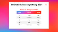 Für das Ranking „Höchste Kundenempfehlung“ in Kooperation mit dem Handelsblatt befragte Yougov im Zeitraum vom 1. Juni 2023 bis zum 31. Mai 2024 mittels Online-Interviews Verbraucher*innen, ob sie eine verwendete Marke weiterempfehlen würden. Zur Berechnung des Wertes wurden die Antworten auf die Fragen „Welche dieser Marken würden Sie einem Freund oder Kollegen empfehlen?“ sowie „Und von welchen dieser Marken würden Sie einem Freund oder Kollegen abraten?“ miteinander verrechnet, indem der Anteil negativer Nennungen vom Anteil positiver Nennungen abgezogen wurde. Der sogenannte „Reccomend-Score“ kann auf einer Skala von -100 bis +100 liegen. Mehr zum Ranking: Höchste Kundenempfehlung 2024 (yougov.com)