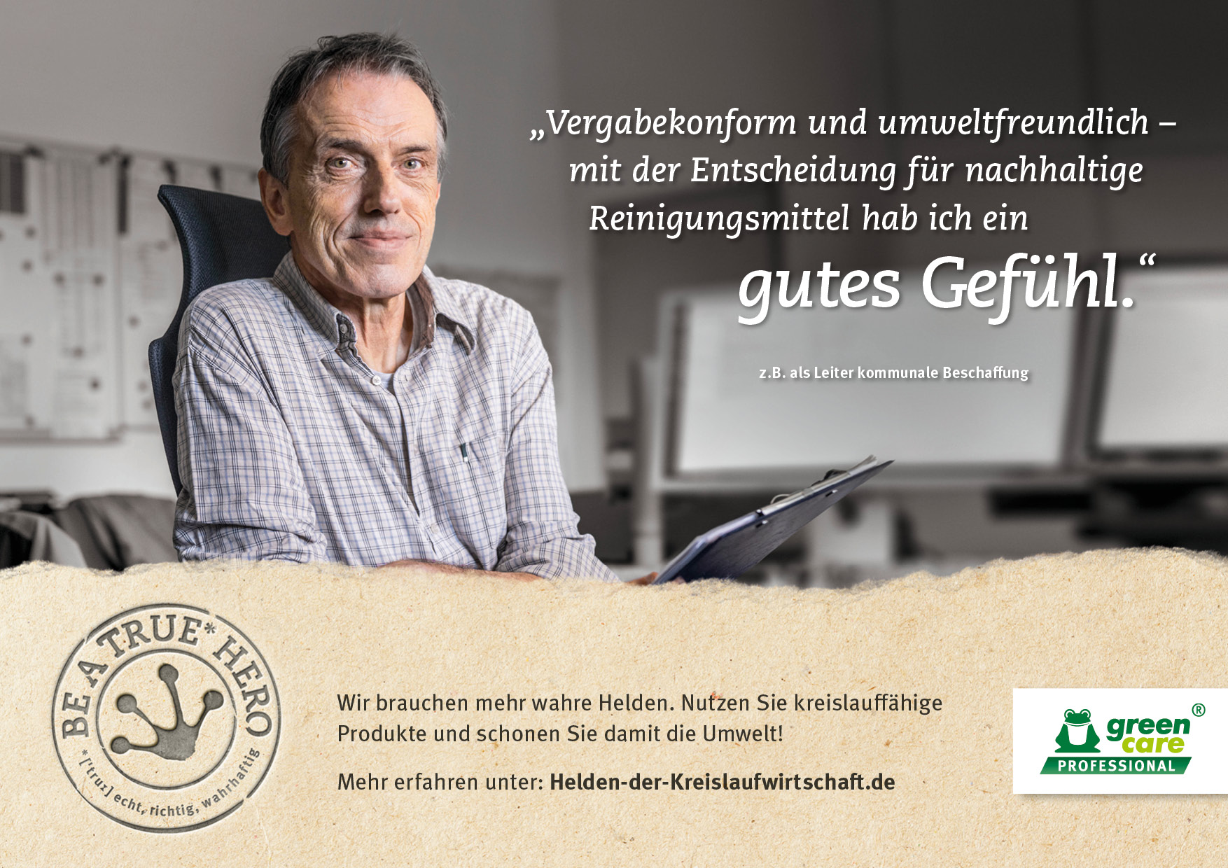Der Reinigungsmittelhersteller realisierte gemeinsam mit der Agentur Active International erstmalig eine flächendeckende Kampagne zum Thema nachhaltige öffentliche Beschaffung im professionellen Reinigungsbereich. Hierzu setzte man mit dem Kampagnenansatz „Klimahelden“ in der Zielgruppenansprache auf einen deutlich kreativeren kommunikativen Hebel als es typischerweise im B2B-Segment üblich ist. Im Mittelpunkt der Klimahelden-Kampagne stand die eigens eingerichtete Kampagnenseite Helden-der-Kreislaufwirtschaft.de mit jeder Menge Informationen für die gezielte Auseinandersetzung mit den Kriterien und Benchmarks für ökologisches Reinigen im professionellen Bereich.