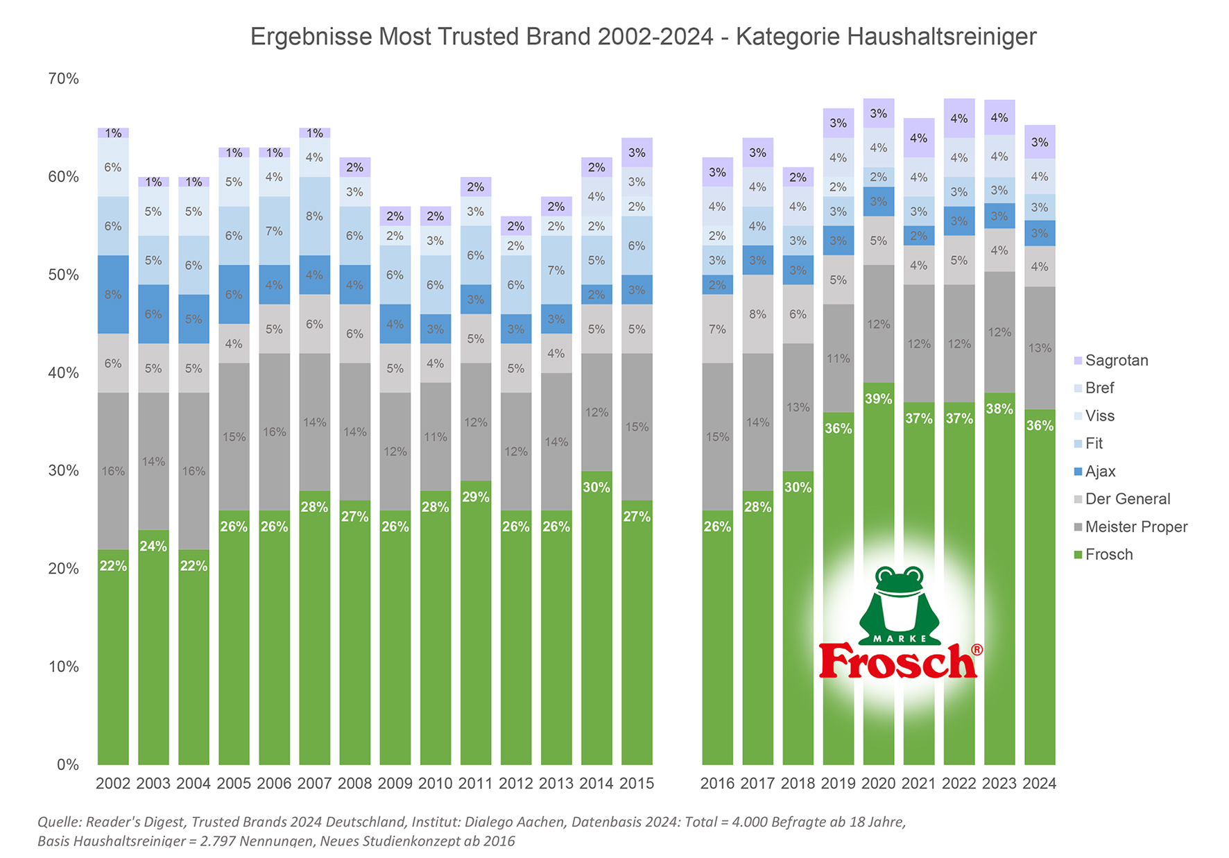 Investitionen in das Vertrauen von Konsument*innen zahlen sich aus – das ist ein Ergebnis der diesjährigen Trusted Brands Studie von Reader’s Digest. Einige der genannten Marken erfahren seit vielen Jahren konstant hohe Zustimmung – darunter auch die Marke Frosch des Mainzer Reinigungsmittelherstellers Werner & Mertz: Bereits zum 23. Mal in Folge sprachen die Befragten ihr in der Kategorie Haushaltsreiniger das größte Vertrauen aus! Unter 154 genannten Marken wurde Frosch mit großem Abstand vor den Mitbewerbern genannt und ist damit erneut die „Most Trusted Brand“ (vertrauensvollste Marke): 36 % der Befragten gaben an, dass sie der Marke Frosch am meisten vertrauen und sie Freund*innen und Familie weiterempfehlen würden.
