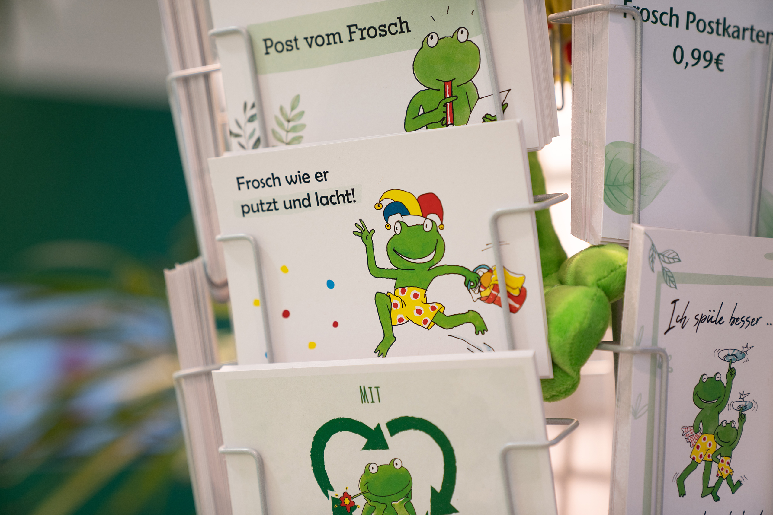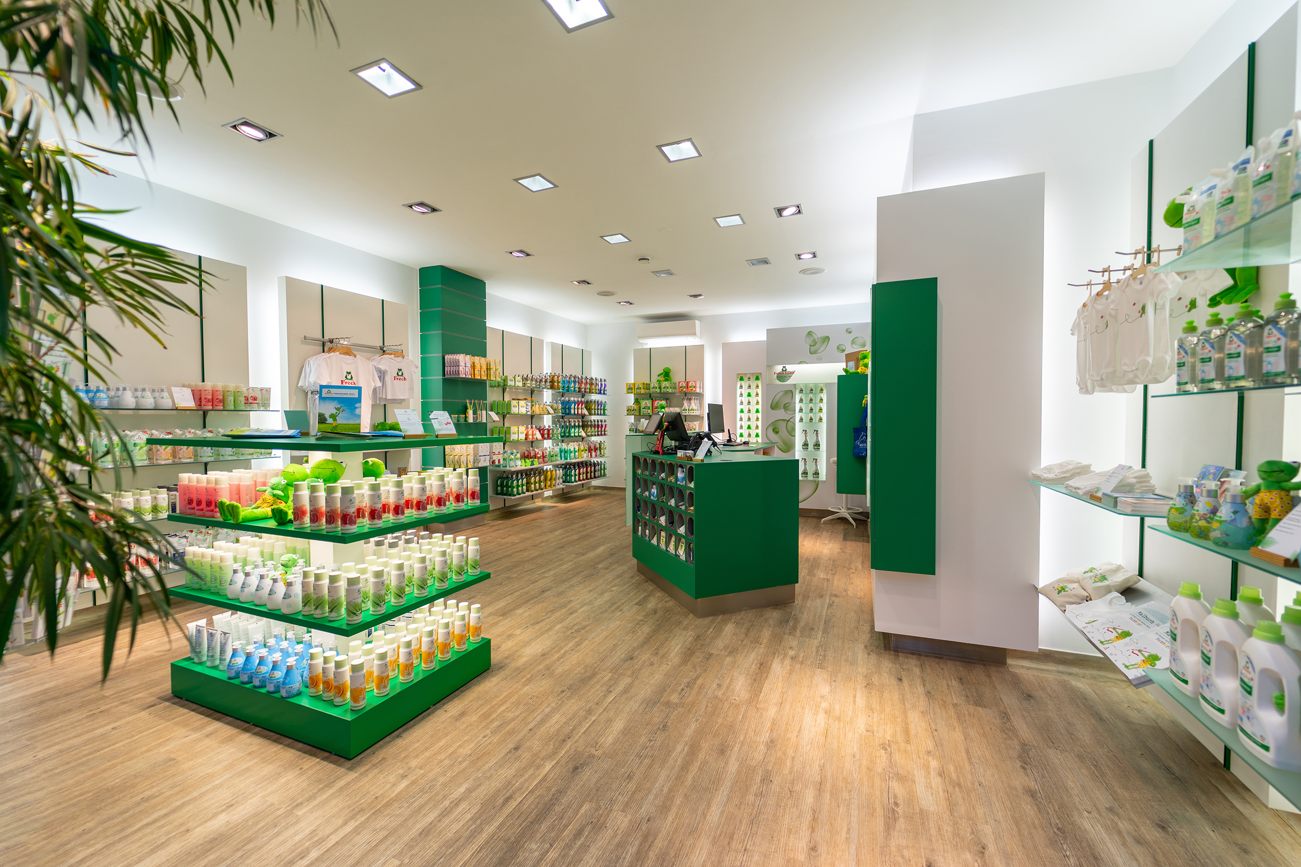 Neben den klassischen Frosch-Produkten – Reinigungs- und Waschmittel, Seifen und Duschgele sowie Frosch Baby Produkte und Frosch Oase Raumerfrischer – gibt es auch exklusive Frosch-Artikel zu kaufen, die eigens für den neuen Laden entworfen wurden. Dazu gehören beispielswese freche Grußkarten, Baby-Bodys und Magnete.