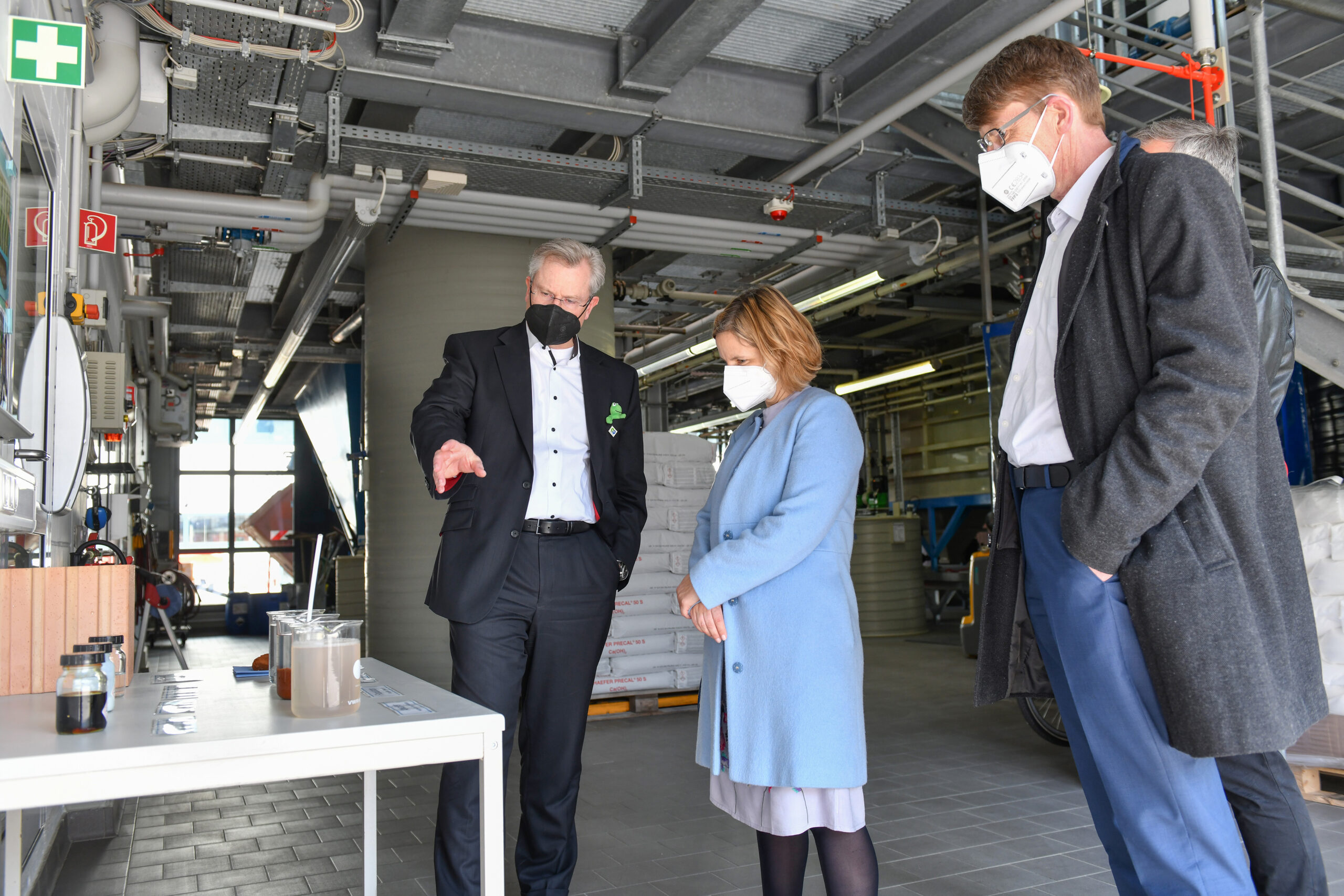 Auch das betriebseigene Wasserzentrum lernte die Ministerin kennen: Statt wertvollen Trinkwassers verwendet das Unternehmen eigenes Brunnenwasser für seine Produktion und kann dank Umkehrosmose-Anlagen auf chemische Zusätze wie Laugen und Säuren bei der Aufbereitung des Wassers verzichten. Das entsalzte Wasser ist der Rohstoff für Produkte – beispielsweise der Marken Frosch und emsal – und wird auch für die Reinigungs- und Spülvorgänge in der Produktion genutzt.