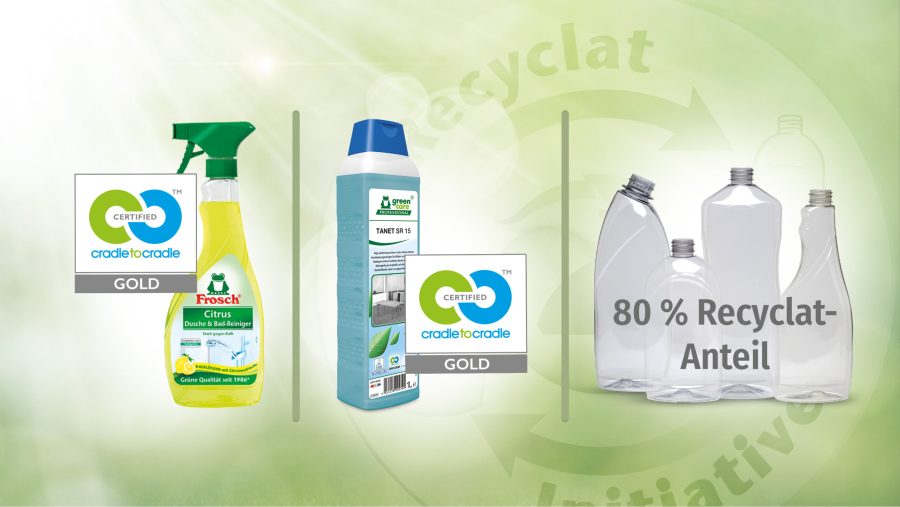 Für die ganzheitlich-nachhaltige Ausrichtung unserer Produkte erhalten wir 2013 gleich zweimal Cradle to Cradle Certified® Gold: Einmal für den Frosch Citrus Dusche- und Bad Reiniger als erstes Reinigungsmittel überhaupt und dann noch einmal für Green Care Professional, das die Auszeichnung als erstes umfassendes professionelles Reinigungs- und Pflegesortiment erhält. Unsere Frosch-PET-Flaschen bestehen inzwischen bereits zu über 80 % aus Recyclat.