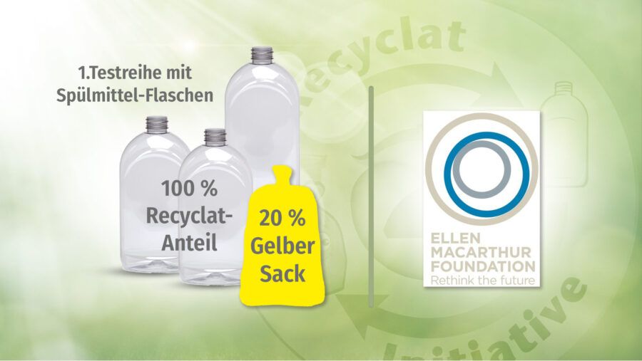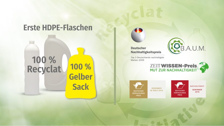 2014 ist ein sehr bedeutsames Jahr für unsere Recyclat-Initiative: Erstmals können wir eine Testreihe mit Spülmittel in den Handel bringen, dessen Flaschen zu 100 % aus Recyclat bestehen, davon erstmals zu 20 % aus der Quelle Gelber Sack. Und gemäß amerikanischer Food Drug Administration (FDA) sind diese Flaschen sogar lebensmitteltauglich – ein Meilenstein! Für unser Engagement gibt es wieder zahlreiche Preise.