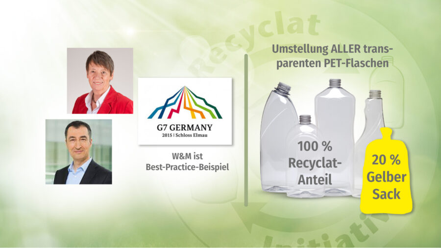 Inzwischen sind wir deutschlandweit als Best-Practice-Beispiel für kreislauffähige Kunststoffverpackungen angesehen: Hochrangige Politiker wie Bundesumweltministerin Dr. Barbara Hendricks und Grünen-Vorsitzender Cem Özdemir besuchen unser Unternehmen in Mainz. Bei einem G7 Workshop stellt Werner & Mertz Inhaber Reinhard Schneider darüber hinaus unsere Initiative als Beispiel für Ressourceneffizienz einem internationalen Publikum vor. Im gleichen Jahr stellen wir all unsere transparenten PET-Flaschen auf 100 % Recyclat mit 20 % Gelber-Sack-Anteil um.