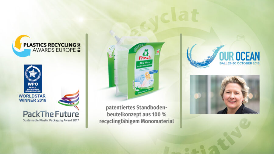 Während unsere rHDPE-Flaschen und rPP-Verschlüsse aus 100 % Recyclat weiterhin mit zahlreichen Preisen ausgezeichnet werden, setzen wir bereits die nächste Innovation um: Wir stellen unser patentiertes Standbodenbeutelkonzept aus 100 % recyclingfähigem Monomaterial fertig. Außerdem stellen wir unsere Initiative und unsere politischen Forderungen mittlerweile weltweit vor, beispielsweise auf dem Weltwirtschaftsforum in Davos oder – auf Einladung von Umweltministerin Svenja Schulze – auf der Our Ocean Conference in Bali.