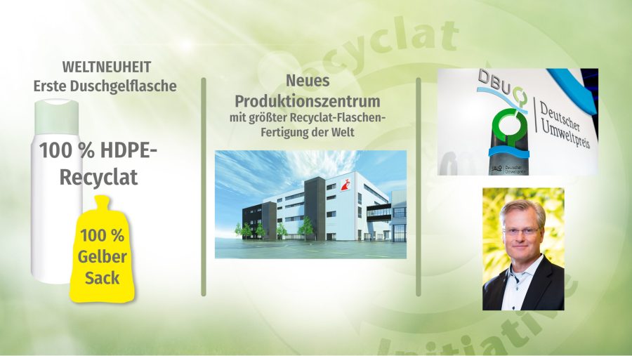 2019 ist für uns ein Jahr der absoluten Superlative: Wir bringen die erste Duschgelflasche mit 100 % HDPE-Recyclat aus der Quelle Gelber Sack auf den Markt – eine Weltneuheit im Kosmetikbereich und ausgezeichnet mit dem Deutschen Verpackungspreis. Außerdem weihen wir im Mai unser neues Produktionszentrum ein, das nun die größte Recyclat-Flaschen-Fertigung der Welt ist! Zur Einweihung hält Grünen-Vorsitzender Robert Habeck eine Keynote und betont: „Die Art und Weise, wie Werner & Mertz arbeitet, müssen wir als Standard der Zukunft sehen!“