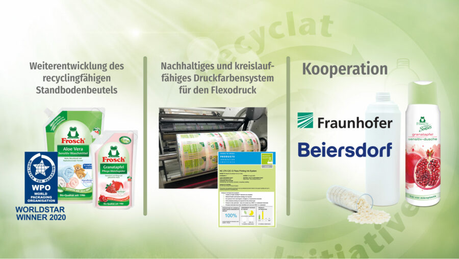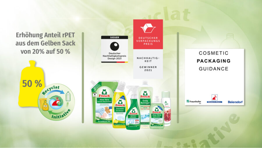 Ein weiterer großer Meilenstein unserer Recyclat-Initiative: Wir können den Anteil von Gelbem-Sack-Material in unseren 100 % rPET-Flaschen von 20 % auf 50 % steigern! Dafür erhalten wir erneut den Deutschen Verpackungspreis in der Kategorie Nachhaltigkeit sowie den Deutschen Nachhaltigkeitspreis Design für unsere kreislauffähigen Verpackungen der Marke Frosch. Im selben Jahr veröffentlichen wir außerdem zusammen mit Beiersdorf und dem Fraunhofer Institut einen Leitfaden zum Einsatz von Recyclat in Kosmetikverpackungen.