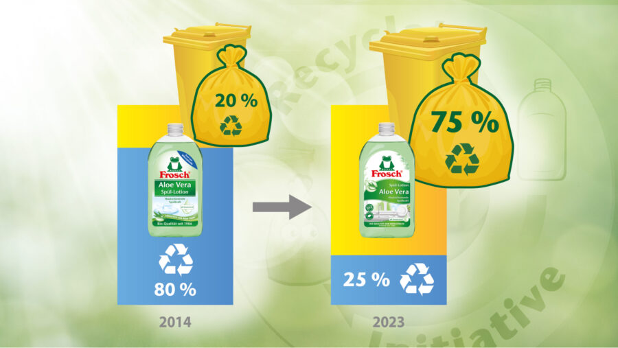 Uns ist gemeinsam mit unserem Partner ALPLA ein weiterer Erfolg für die echte Kreislaufwirtschaft gelungen: Wir erhöhen bei den bewährten Frosch-PET-Flaschen aus 100 % Altplastik den Anteil des rPETs aus dem Gelben Sack von 50 auf 75 %. Ende 2023 sind bereits mehr als vier Millionen PET-Flaschen mit dem gesteigerten Anteil im Handel. Damit schreiten wir einmal mehr als Pionier bei der technischen Erschließung des Materials aus dem Gelben Sack für hochwertige Verpackungen voran.