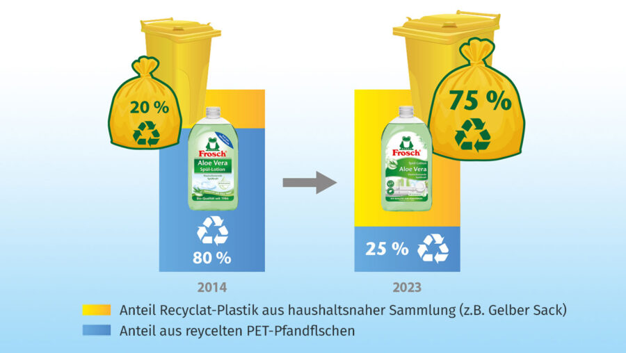 Wir haben den Anteil des Gelben Sack Materials in unseren Frosch Flaschen auf 75 Prozent erhöht!